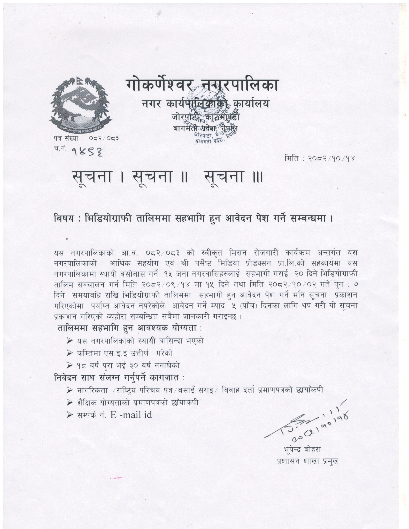 भिडियोग्राफी तालिममा सहभागी हुन आवेदन पेश गर्न म्याद थप सम्बन्धी सूचना ।
