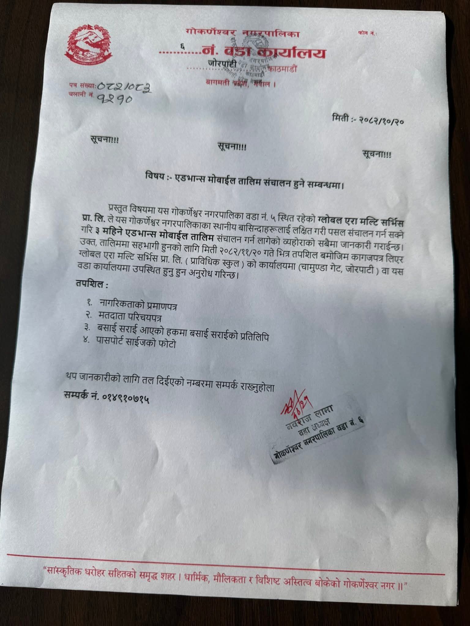एडभान्स मोबाइल तालिम संचालन हुने सम्बन्धमा।