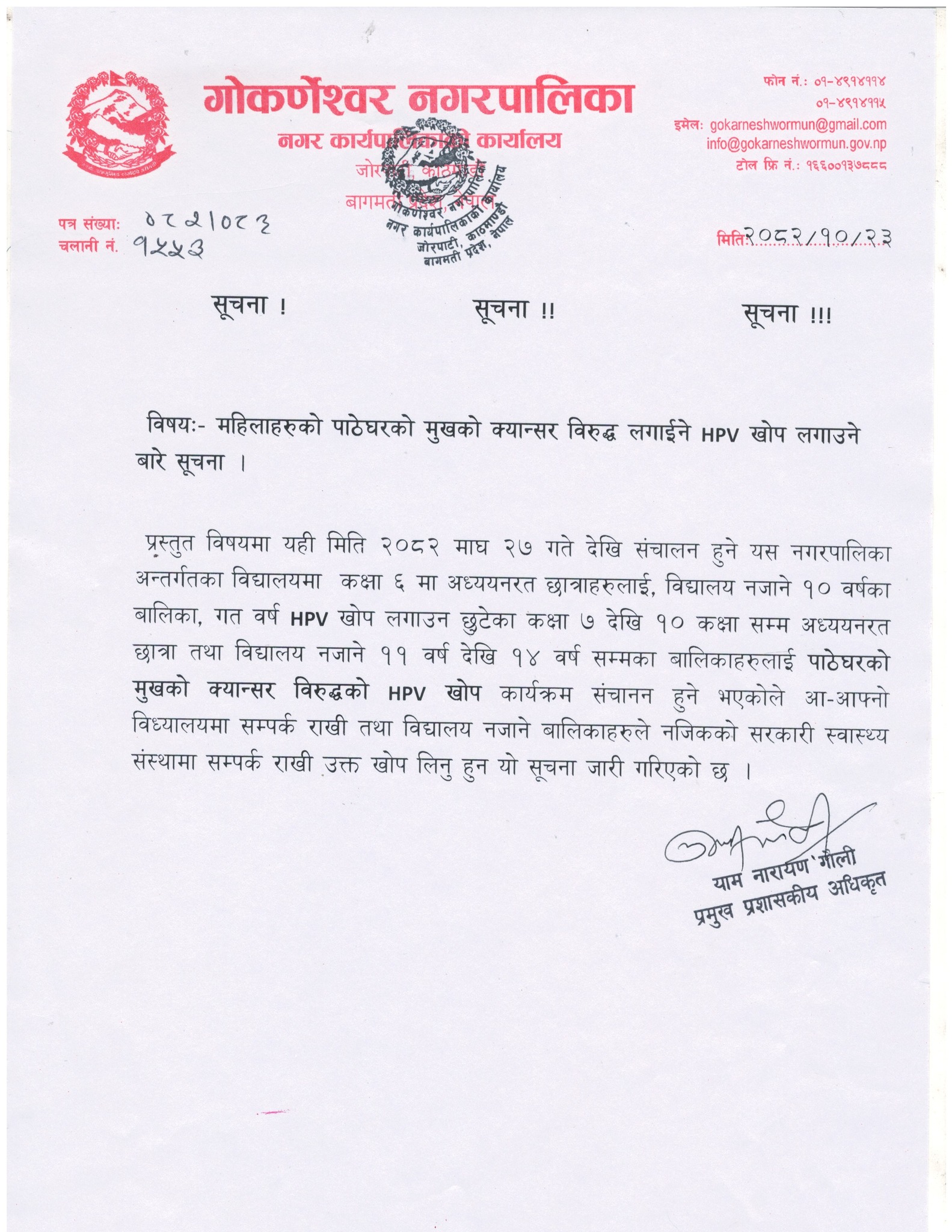महिलाहरुको पाठेघरको मुखको क्यान्सर विरुद्ध लगाइने ज्एख् खोप लगाउने बारे सूचना ।
