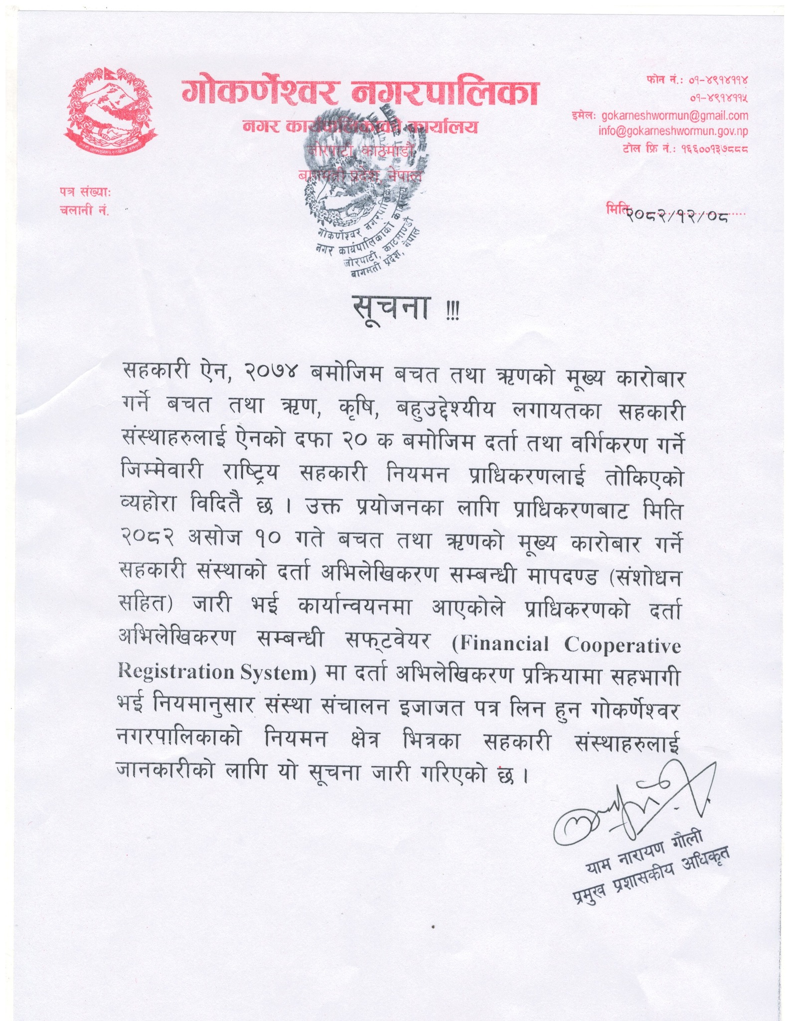 गोकर्णेश्वर नगरपालिका भित्रका सहकारी संस्थाहरुलाई जरुरि सूचना ।