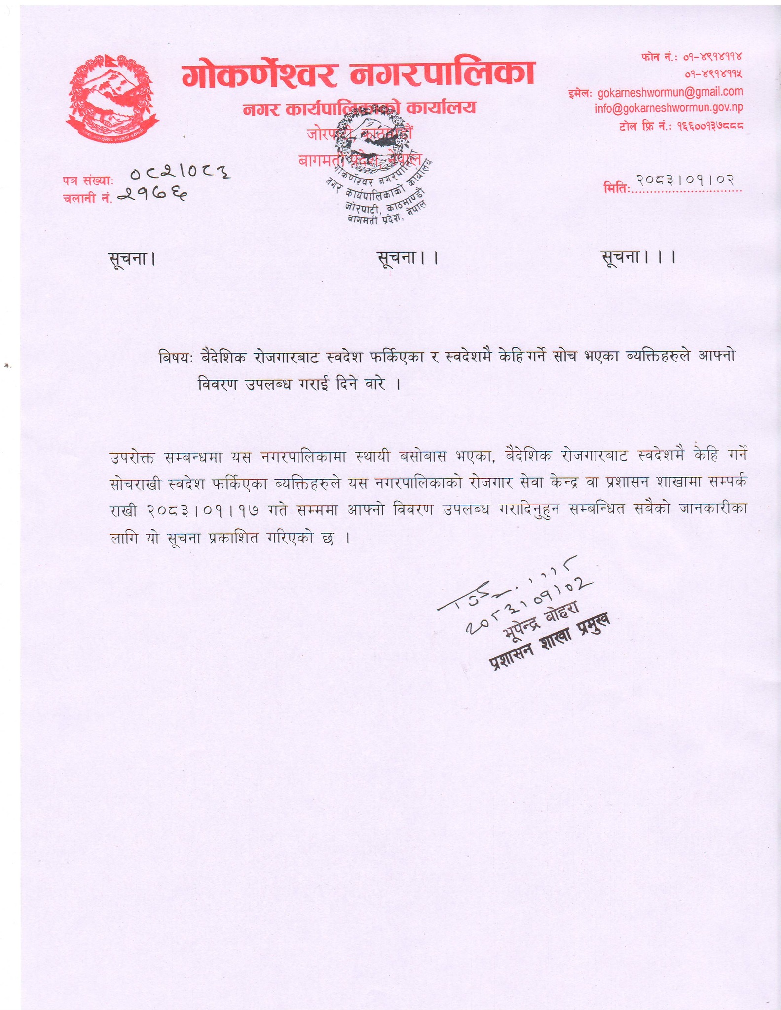 गोकर्णेश्वर नगरपालिकासंग फोहोरमैला व्यवस्थापन सम्बन्धी भएको सम्झौता सम्बन्धी अत्यन्त जरुरि सूचना।